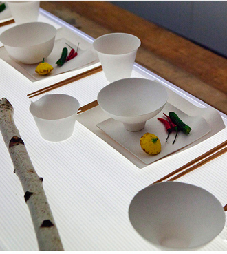 The concept revolved around the art of impermanence, the transient nature of life, the cycle and recycle of things. The idea was manifested in a picnic concept. We used paper plates, cups, bowls and bamboo utensils made from recycled materials. The beautiful paper dinnerware and bamboo utensils can be used and thrown away to be recycled again. A white birch branch was used as a surreal centerpiece – symbolizing wood charcoal typically burned for a picnic BBQ.