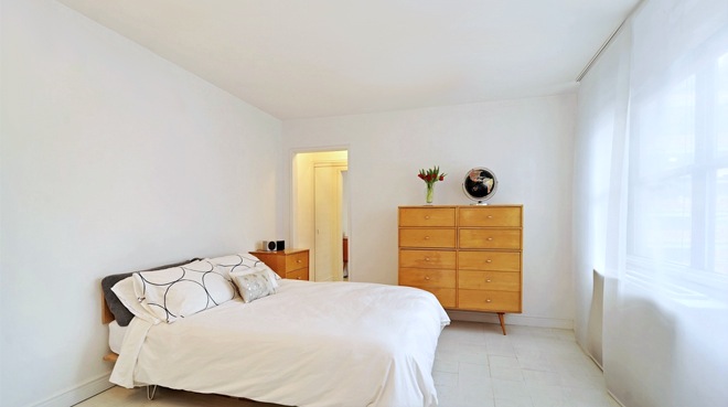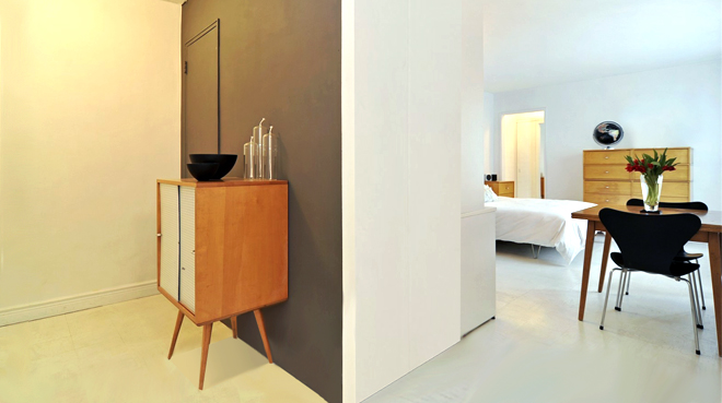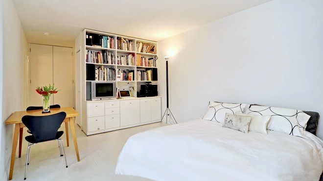 This minimal studio apartment is in a white brick 60's coop building. In keeping with the 60's architecture of the building, we placed Paul McCobb Planner Group midcentury furniture, Jacobsen chairs for form, and a George Nelson bed.