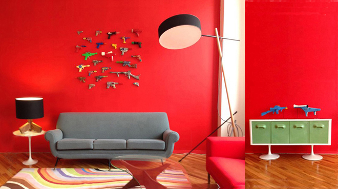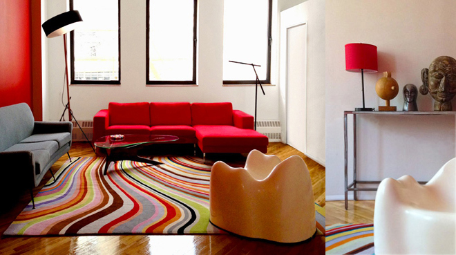 The Ray Gun collection was treated like a gallery installation, hung on the red wall. The Ray Guns, mostly silver with primary colored details, become animated against the red wall. Underneath the "exhibit" we placed a vintage Italian sofa, which was recovered in silver gray Knoll boucle to complement the color of the guns. The loft was given a modern current feel with new lighting fixtures, and furnishings. We chose a rug that fit their criteria; lots of color in a free form Swirl stripe from the Rug Company, which lent a sort space age air to the place befitting the project.