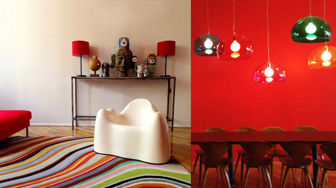 We chose a bright red modern chaise sofa, and painted the opposite wall the same red, leaving all other walls white. The red sofa "talks" to the adjacent red wall.